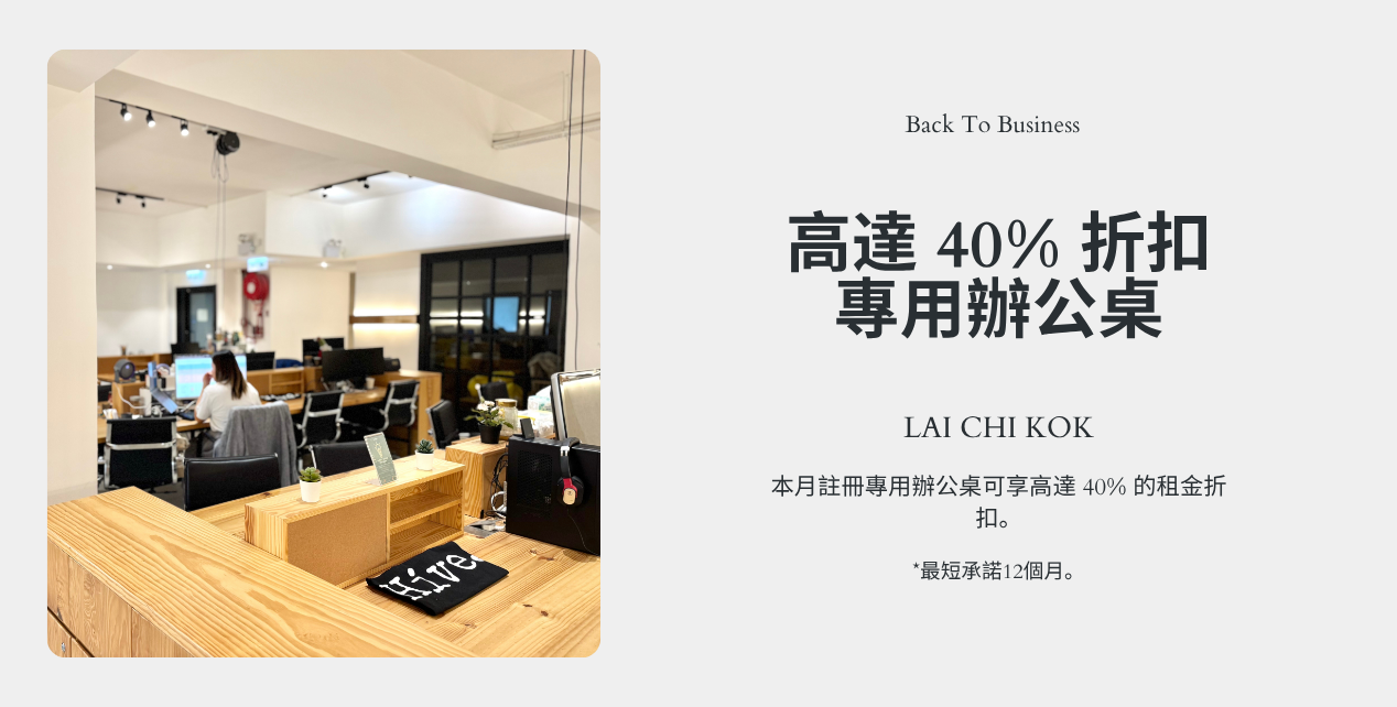 本月註冊專用辦公桌可享高達 40% 的租金折扣。